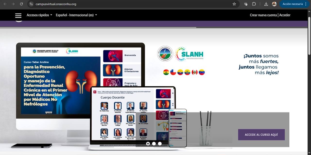 El 15 de octubre, la Dra. María del Carmen Calle, Secretaria Ejecutiva del ORAS-CONHU, clausuró el “1er Curso Andino para la Prevención, diagnóstico oportuno y manejo de la ERC en el primer nivel de atención por médicos no nefrólogos”, organizado en colaboración con la Sociedad Latinoamericana de Nefrología e Hipertensión (SLANH). Esta iniciativa buscó fortalecer de manera integral los conocimientos, habilidades y competencias necesarias para prevenir, detectar tempranamente, manejar adecuadamente y referir oportunamente a pacientes con enfermedad renal crónica, considerando el contexto epidemiológico, social y clínico de la región andina.