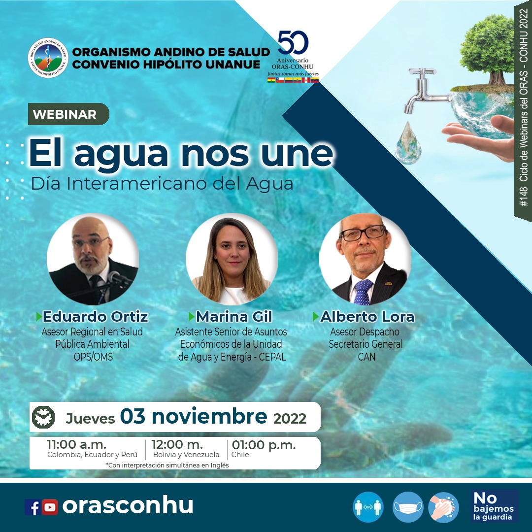 Pineda, B., Calle, MC., Ortiz, E., Gil, M., Lora, A. (2022, 3 noviembre). El agua nos une, Día Interamericano del Agua [Webinar]. Organismo Andino de Salud - Convenio Hipólito Unanue.