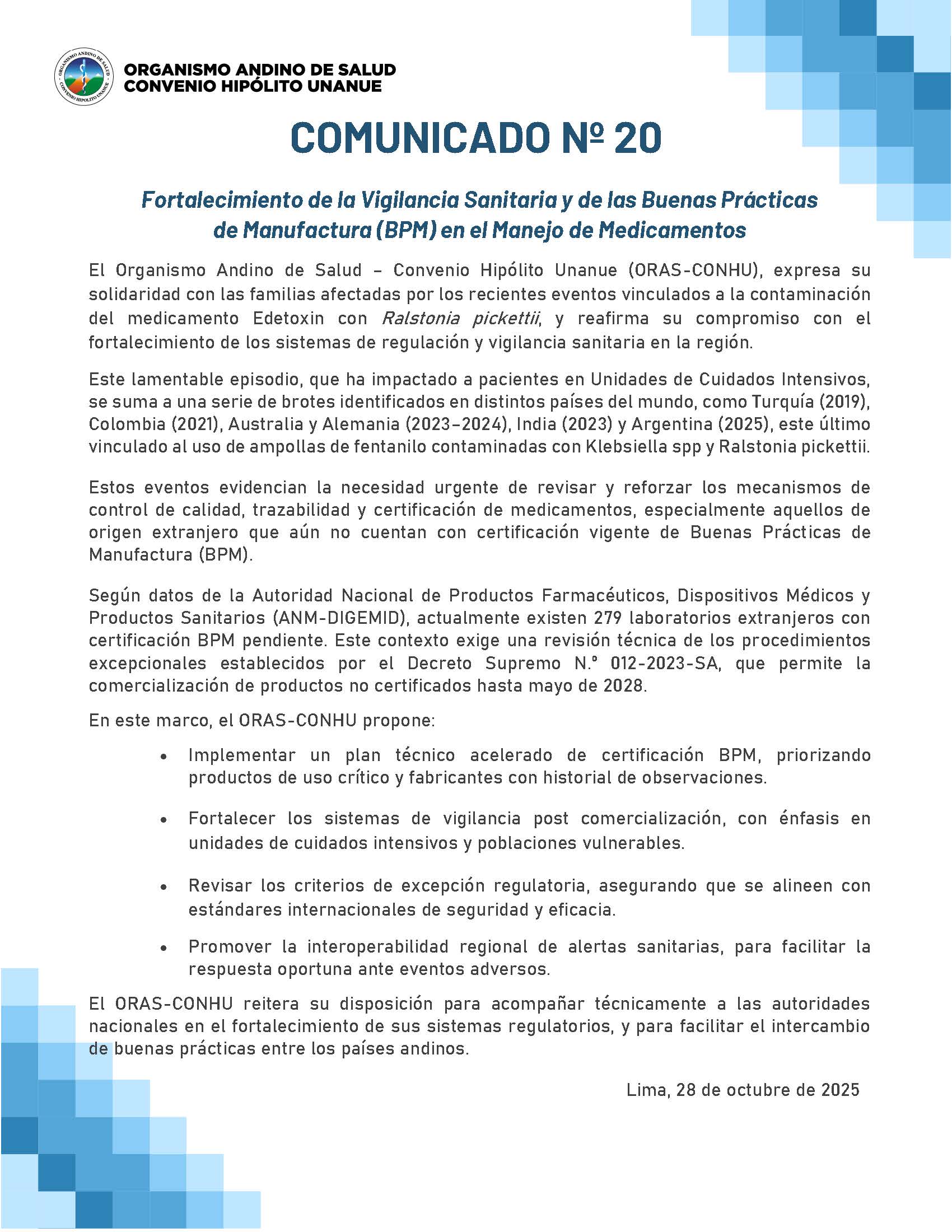 El Organismo Andino de Salud – Convenio Hipólito Unanue (ORAS-CONHU), expresa su solidaridad con las familias afectadas por los recientes eventos vinculados a la contaminación del medicamento Edetoxin con Ralstonia pickettii, y reafirma su compromiso con el fortalecimiento de los sistemas de regulación y vigilancia sanitaria en la región.